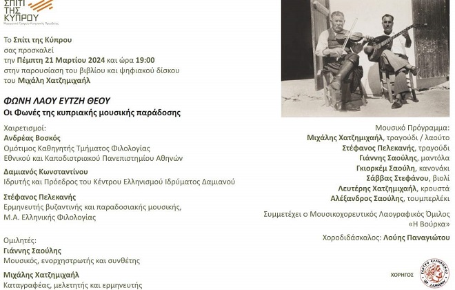 Πραγματοποιήθηκε με μεγάλη επιτυχία την Πέμπτη 21/3/2024, στο Σπίτι της Κύπρου στην Αθήνα, η παρουσίαση του βιβλίου και του ψηφιακού δίσκου του μελετητή της Κυπριακής Παράδοσης Μιχάλη Χατζημιχαήλ, με τίτλο “ΦΩΝΗ ΛΑΟΥ ΕΥΤΖΗ ΘΕΟΥ”.